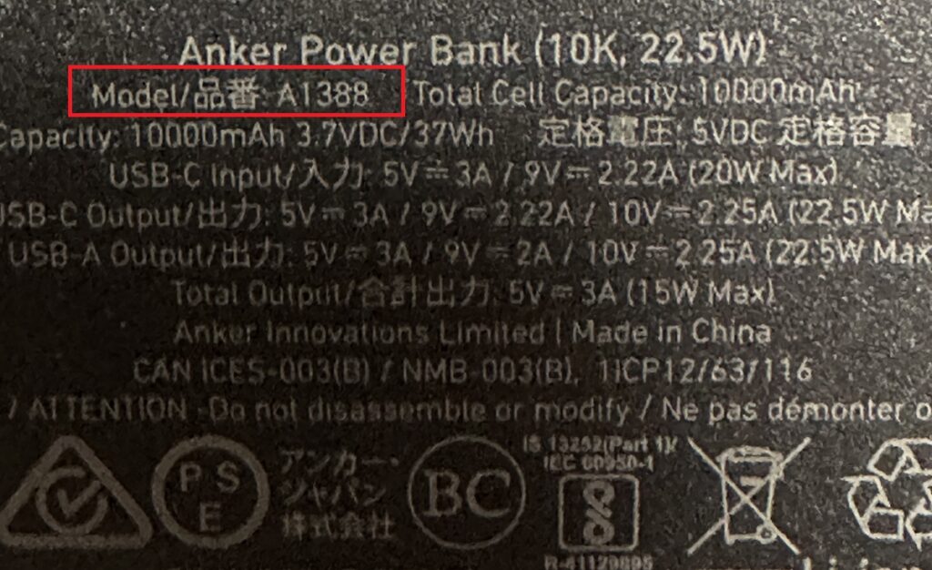 写真は私が保有している、ANKER POWER BANKの商品裏面の仕様の写真です。 小さくて読みにくいのですが、こちらに商品型番が書いてあるので、そこでリコール対象になっているかを確認くださいね。A1388はリコール対象外のようですね!ちょっと、一安心です。