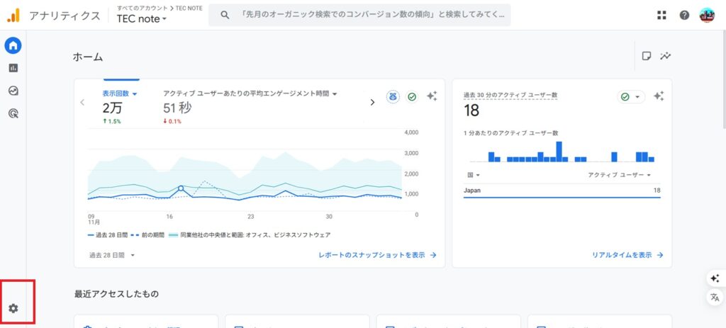 ▶ Step 1:GA4 の左下「管理」(歯車アイコン)をクリック