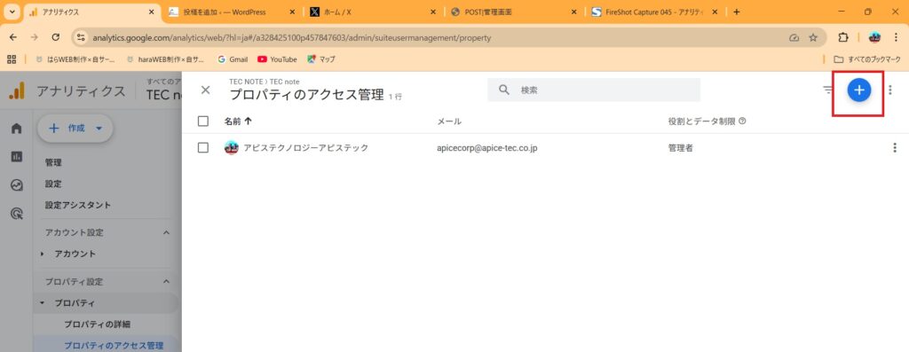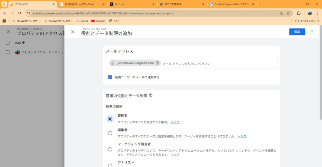 ※ ここで入力した Gmail が GA4 を閲覧できるようになります。